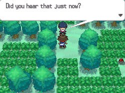 Teraz wracamy do młodzieńca i idziemy na samą górę, aż uderzymy w drzewa. Skręcamy w prawo - znajduje się tutaj bardzo wąska ścieżka, którą właśnie podążamy. Gdy tylko z niej wychodzimy słyszymy ewien dźwęk - to chyba jakiś Pokemon! W każdym razie, podejdzie do nas Hugh mówiąc, że też coś słyszał. Podnosimy z ziemi Potion i idziemy na południe.