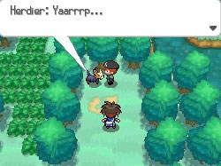 Po odzyskaniu kontroli możemy zagadać do żony właściciela rancza, by ta uleczyła nasze Pokemony. Teraz idziemy w lewo - mijamy niebieskowłosego pana poszukującego Herdiera - gdy niemal dojdziemy do ściany, idziemy w dół i pokonujemy trenerkę. Od niej idziemy cały czas w prawo (przez trawy), by w końcu znaleźć leżący na ziemi Poke Ball. Wracamy do trenerki i idziemy w górę, a następnie przez dziurę w płocie w prawo i natychmiast na północ. Pojawi się Hugh. Mówi, że zobaczy, czy Herdier nie zagubił się czasem na północy. Szybko idziemy w tym właśnie kierunku.