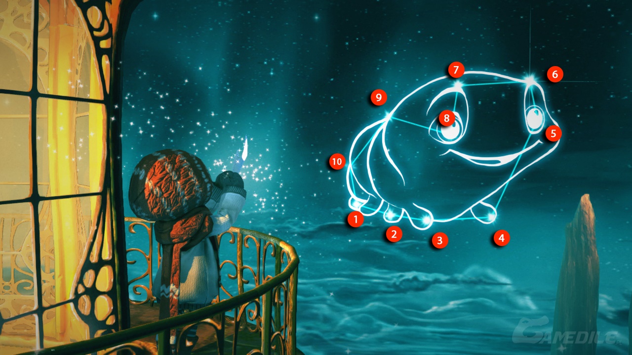Sterujemy Renie i trafiamy na sam szczyt latarni - wydaje się, że nie mamy stąd żadnego wyjścia. Okrążamy latarnię do momentu, kiedy na ekranie nie pojawią się większe gwiazdy - używamy na nich naszego odłamka. Z tego zacznie się wyłaniać promień. Będziemy musieli rysować kształty na niebie, począwszy od gwiazdy świecącej się na niebiesko. Najlepiej przedtem pozbyć się tych białych (będą nam przeszkadzały) poprzez najeżdżanie na nie.