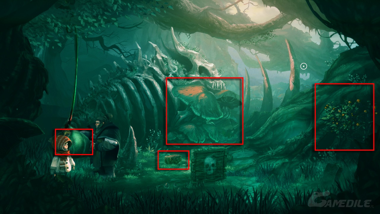 Poszukiwania gorzkiego smaku rozpoczynamy od znajdujących się na środku tej lokacji grzybów - próbujemy ich, ale okaże się, że nie są gorzkie. Próbujemy również jagód rosnących na drzewku po prawej strony - one również nie są gorzkie. Przechodzimy przez korzenie do kolejnej lokacji, by kontynuować nasze poszukiwania.