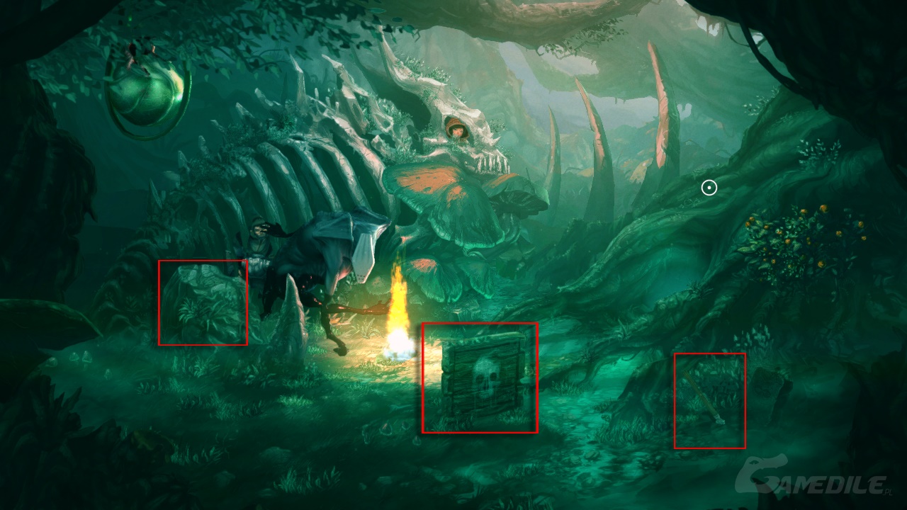 Teraz kierujemy Renie. Samuel chowa nas słysząc, że zbliża się Poszukiwacz. Zauważamy włócznię, którą wcześniej wypluła roślina. Musimy się jakoś do niej dostać. Zwracamy uwagę, czy Poszukiwacz na nas patrzy - jeżeli nie, udajemy się do najbliższej kryjówki. Robimy to dwukrotnie (trasa powyżej), podnosząc w końcu włócznię. Po drodze dwa razy utkniemy - wtedy oswobadzamy się (przy pomocy Sama, a technicznie - klikając na Renie i poruszając myszką). Gdy dorwiemy włócznię, klikamy nią w Poszukiwacza. Okazuje się, że wybuch spowodowany przez Noah (a raczej przez zniszczoną królową Miodokleszczy) rozproszy Poszukiwacza, który już nie będzie nas słyszał - używamy na nim włóczni.