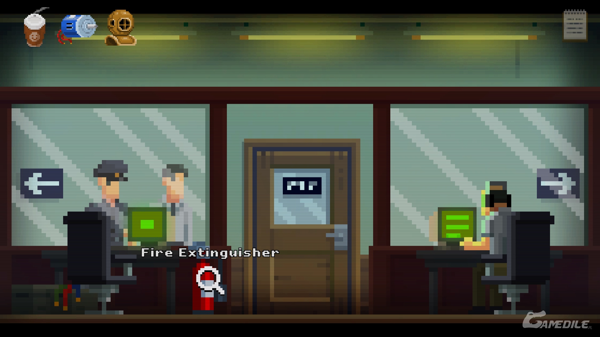 W kolejnej lokacji zabieramy spod drzwi pustą gaśnicę (bust fire extinguisher). Tuż przy wolnym krześle leżą też kable (headphone wires), które wkrótce nam się przydadzą. Wchodzimy do pokoju odpraw. Pali się! I NIKT NIC Z TYM NIE ROBI! Chwytamy stojącą na stole bitą śmietanę (whipped cream). Uzupełniamy nią gaśnicę, otrzymując sprawny egzemplarz (fixed fire extunguisher). Używamy go do ugaszenia pożaru.