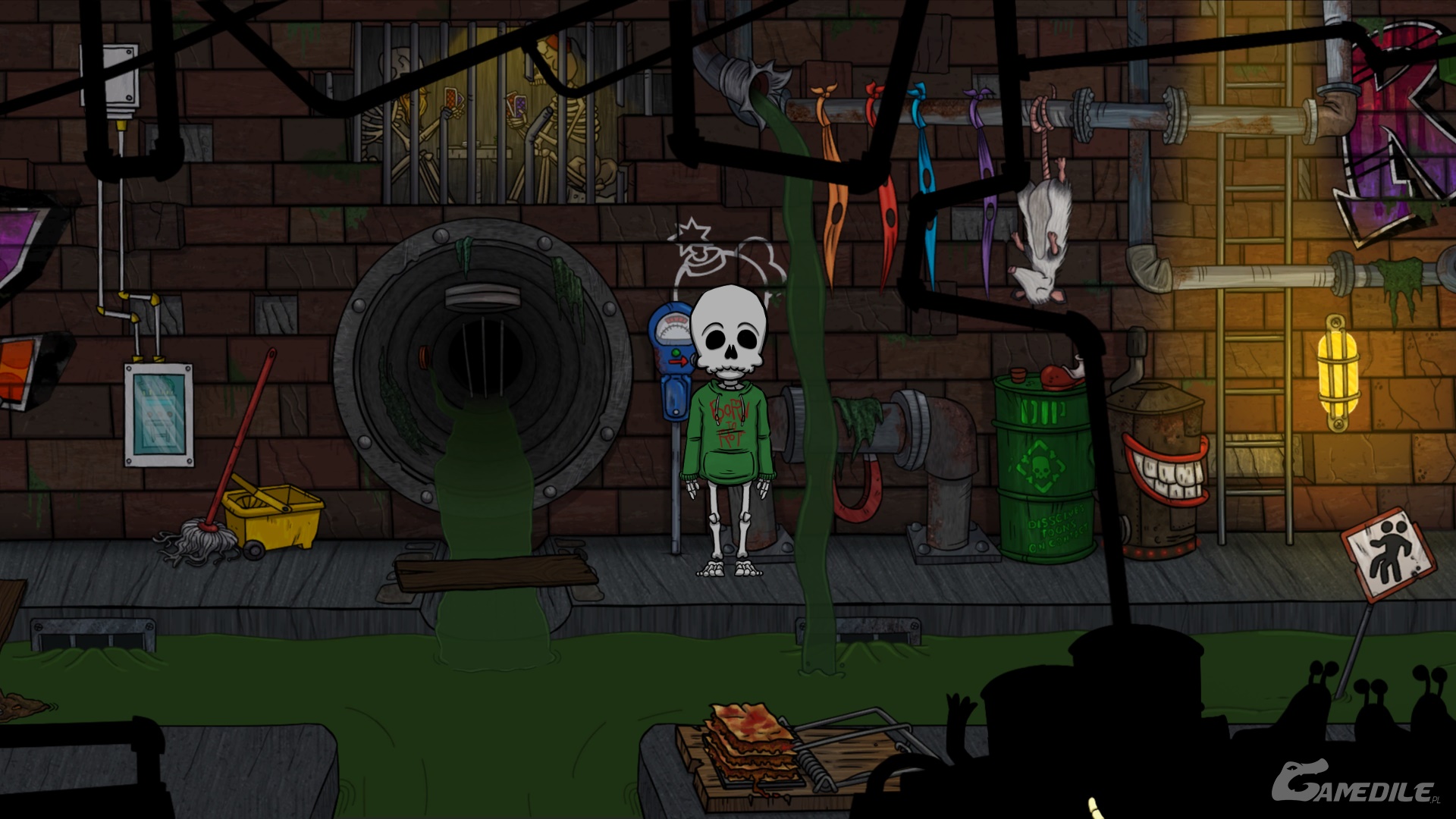 Trafiamy o swoistego salonu. Rozmawiamy tutaj z potworem z kurzu (dust monster) - planuje on podbić świat, jednak nie ma zbyt precyzyjnego planu na zrobienie tego. Podnosimy urnę z prochami (urn with ashes) stojącą nad kominkiem, by znaleźć w niej gumę do żucia (chewing gum). Wtrąci się narrator tłumacząc nam, że niektóre obiekty jesteśmy w stanie podnieść więcej, niż tylko jeden raz. Podnosimy też sztuczną szczękę (dentures) ze szklanki tuż obok. Jako że w chwili obecnej nie możemy zejść na dół, gdyż kręci się tam ekipa remontowa, wracamy do łazienki. Tutaj używamy spłuczki toaletowej (toilet flush) - nasz bohater trafi do kanałów, a w międzyczasie zobaczymy, jak ekipa remontowa dostaje się do łazienki (ale na chwilę obecną udaje się na lunch).