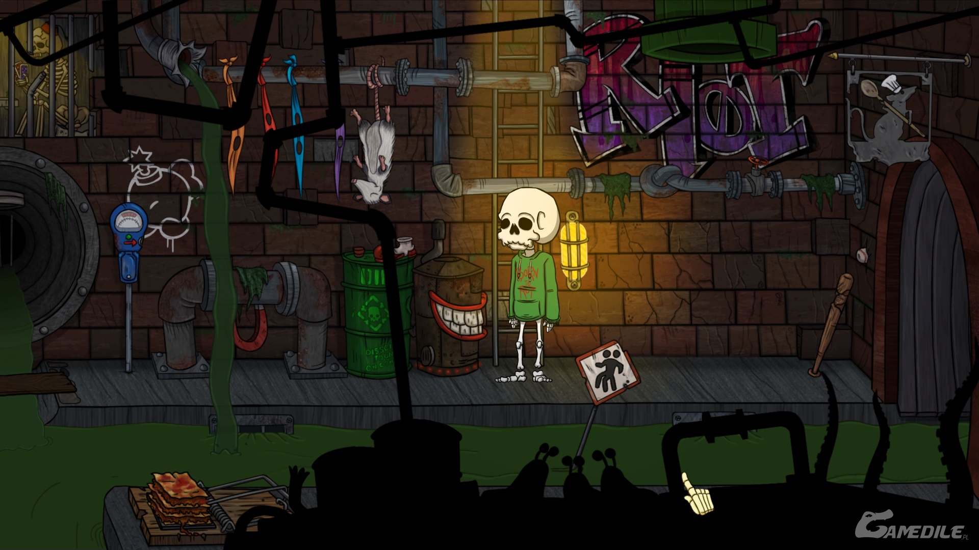 W tym miejscu używamy przed chwilą podniesionej gałki na opalarce (blowtorch). Wypalimy tym samym całą otoczkę, pozostawiając po gałce tylko śrubę (screw). Otwieramy nasz ekwipunek i używamy jej na wiertarce - jest ona już wyposażona i gotowa do działania. Udajemy się więc do właściwej części kanałów i w lewo, do krokodyla. Na nim używamy wspomnianej wiertarki - uwalniamy tym samym groźnego krokodyla z bólu, a sami pozyskujemy koła zębate (gears). Ich natychmiast używamy w naszym ekwipunku na budziku (alarm clock), tym samym go naprawiając. Teraz idziemy do wejścia do baru - zamiast jednak z niego skorzystać, używamy drabiny tuż obok, by dostać się na powierzchnię.