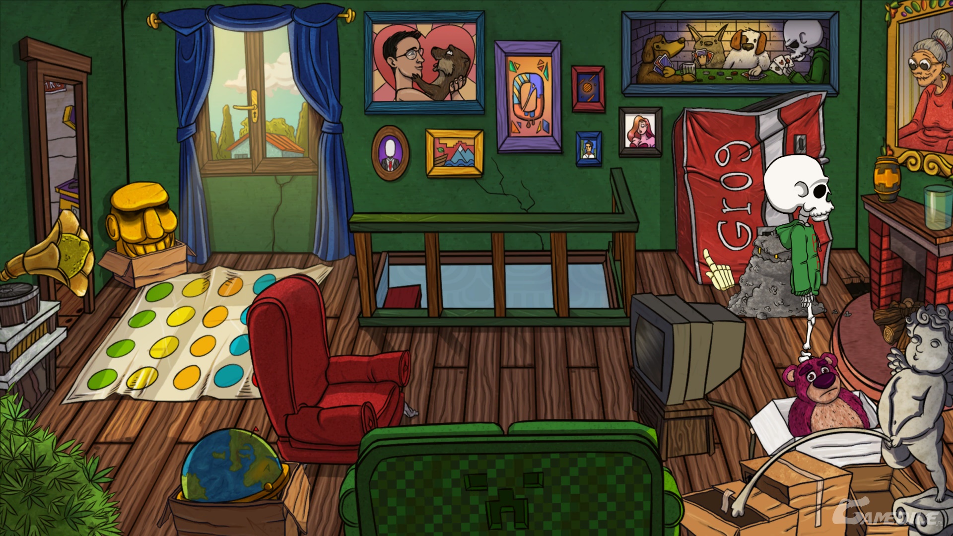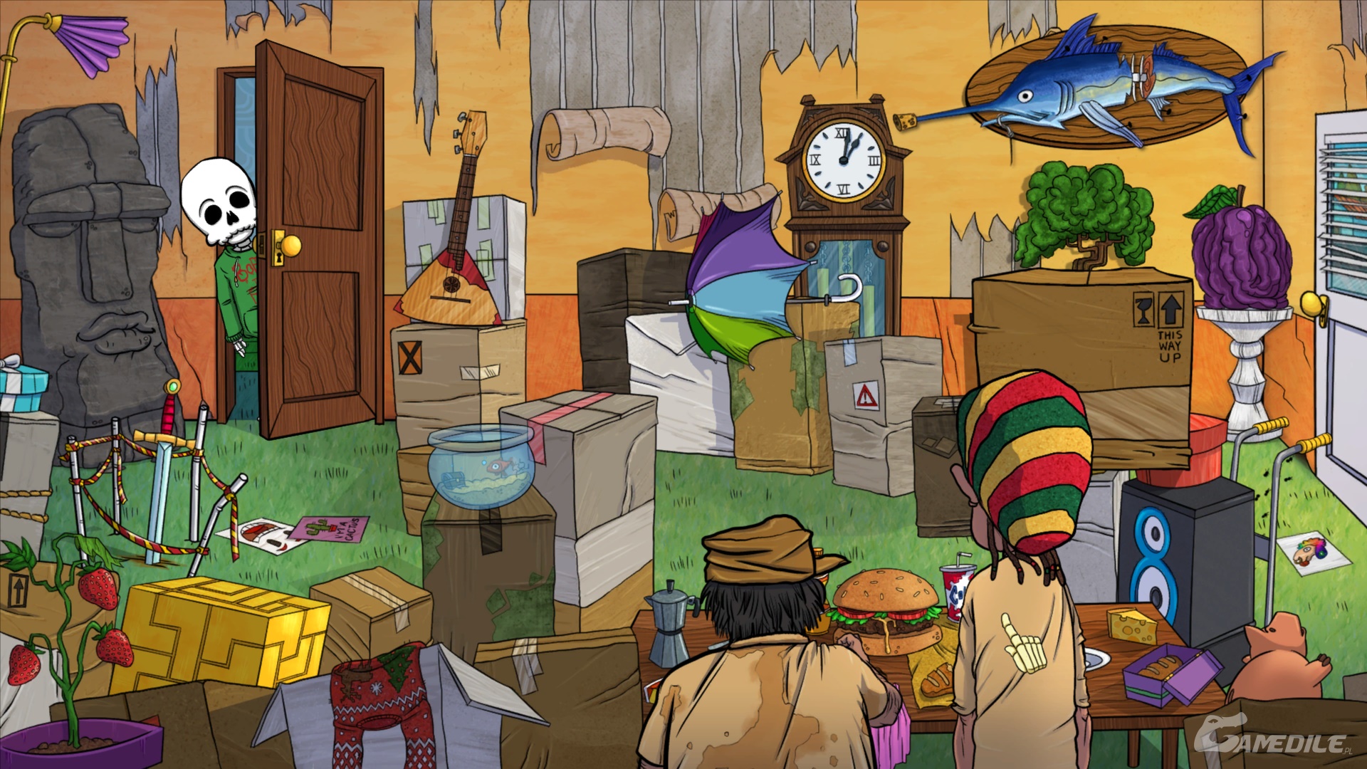 W chwili obecnej w tym pomieszczeniu śniadanie jedzą nasi „specjaliści” od przeprowadzek. Zauważamy znajdujący się po lewej stronie posąg moai - używamy na nim gumy do żucia, a ten ją dla nas przeżuje. Odbieramy kupę przeżutej gumy do żucia (giant wadd of chewing gum), a następnie opuszczamy to pomieszczenie i kierujemy swoje kroki na pierwsze piętro.