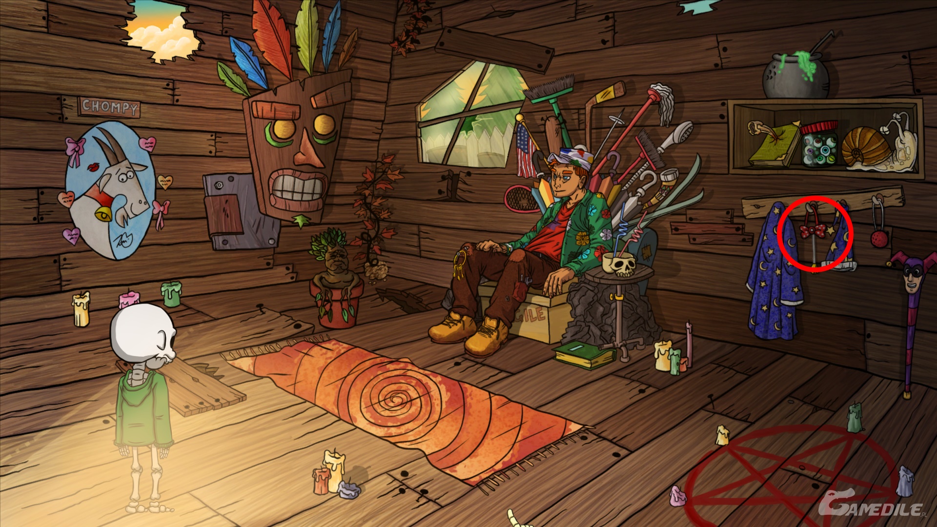 Przechodzimy w prawą część ekranu. Podnosimy znajdującą się na tablicy mapę (map), a następnie ze śmietnika po prawej stronie domku wyciągamy kolejną baterię (battery). Teraz wchodzimy do domku.