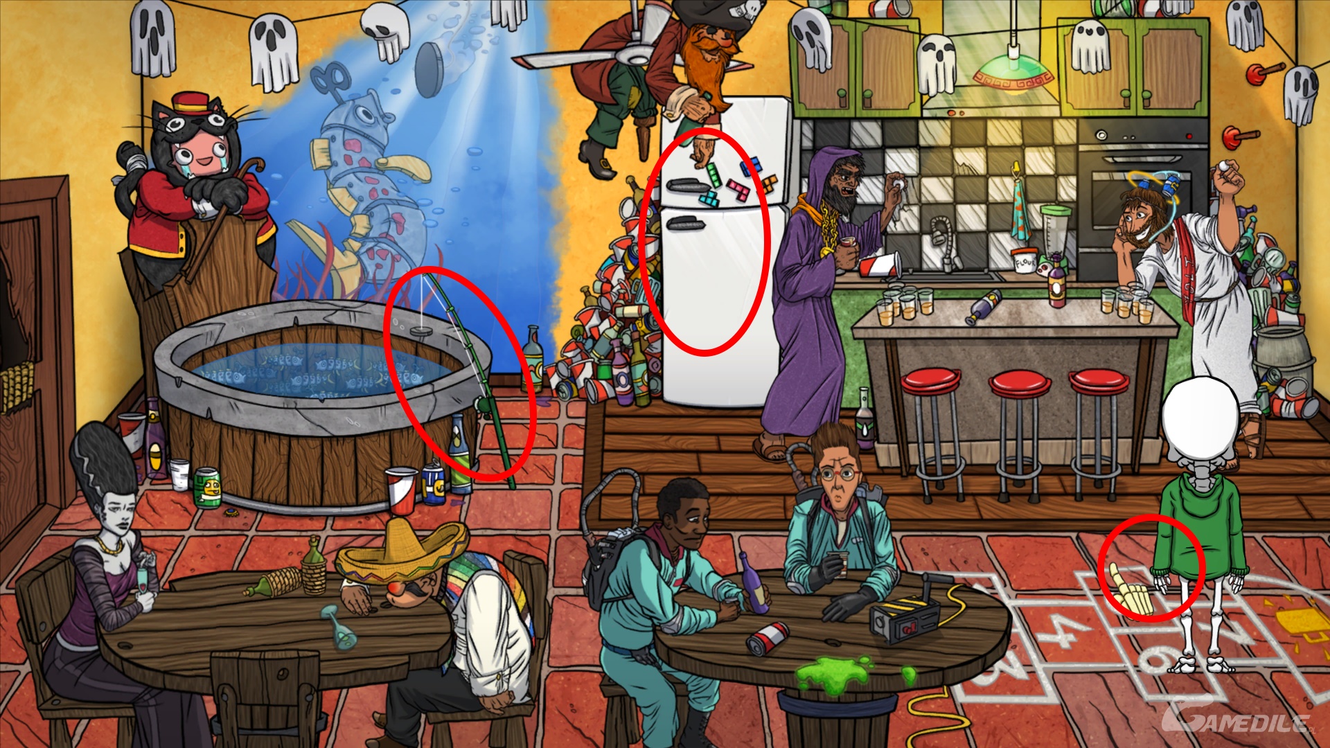Podchodzimy do baru - po drodze przechodzimy po płytce w podłodze, zaznaczonej na rysunku. Gdy ta zacznie się ruszać, przesuwamy ją i zabieramy zapałki (matches). Próbujemy użyć wędki - nie przyniesie nam to korzyści, a bohater stwierdzi, że została sfałszowana. Zaglądamy do lodówki, z której wyciągamy papryczkę chili (chili pepper) oraz butelkę absyntu (absinthe). Jeżeli chcemy, rozmawiamy z wszystkimi osobami w pomieszczeniu. Następnie udajemy się w lewo, do komórki.