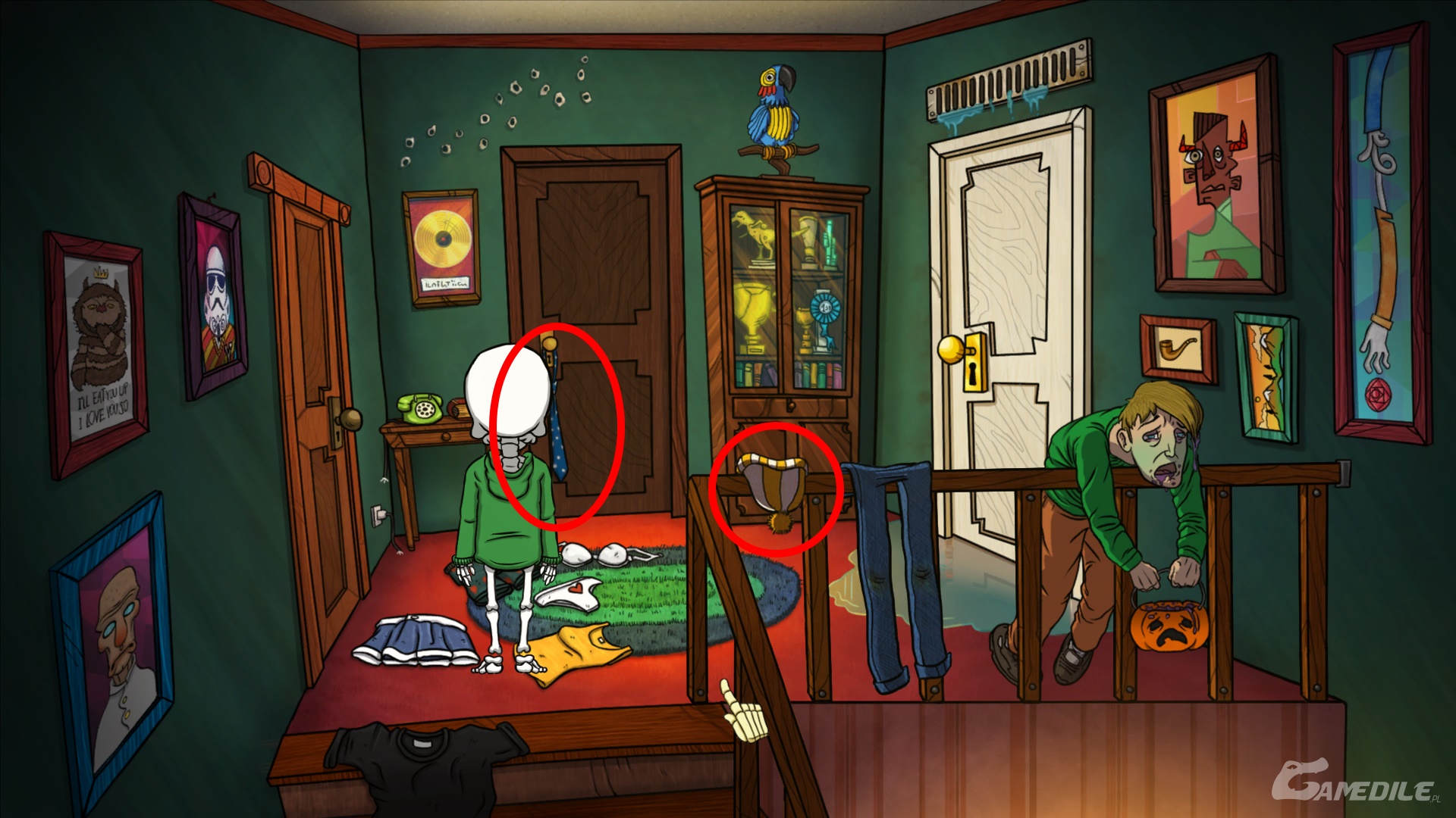 Na miejscu podnosimy krawat (tie) wiszący na klamce. Podnosimy też czapkę (cap), wiszącą na barierce, by pozyskać włosy (hair). Używamy ich na lalce z naszego ekwipunku - w ten sposób pozyskamy niekompletną lalkę voodoo (incomplete voodoo doll). Jeśli chcemy, przechodzimy do pomieszczenia po lewej stronie, korzystając z brązowych drzwi, by zdobyć osiągnięcie. W przeciwnym wypadku, opuszczamy budynek i udajemy się do domku na drzewie.