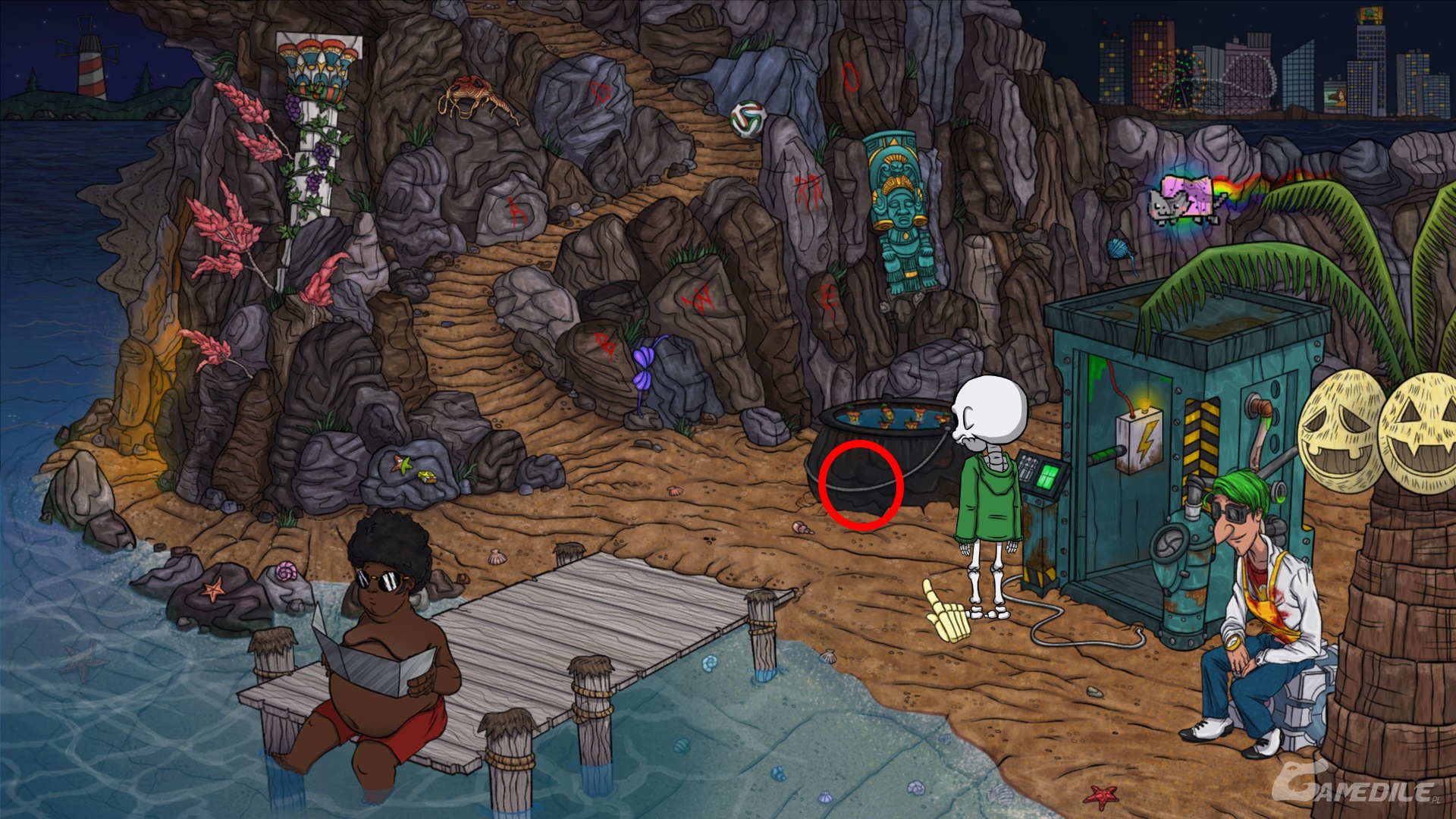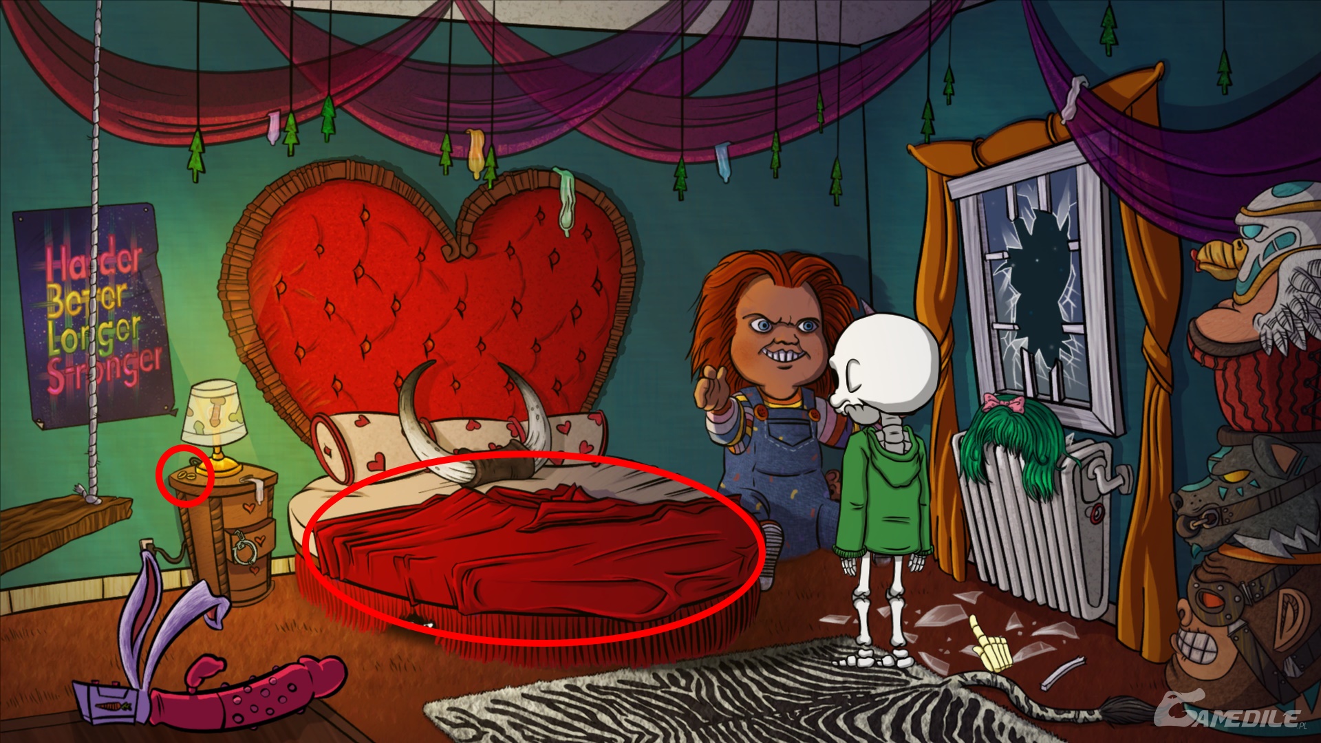 Wracamy na miejsce imprezy. Wchodzimy do domku, a następnie na górę i drzwiami w lewo. Tutaj dajemy rosiczce (carnivorous plant) nasze nasiona - ta padnie, a my możemy teraz użyć obrazu (picture) kapitana. Za nim ukaże się sejf (safe) - niestety, w tym momencie nie możemy z niego skorzystać. Wychodzimy, udajemy się na cmentarz, schodzimy do grobowca i idziemy w lewo. Gadamy z zombie, by dostać od niego szampon bubble bath i wracamy na miejsce imprezy, wchodzimy na górę i przez drzwi do pokoju kochanków.
