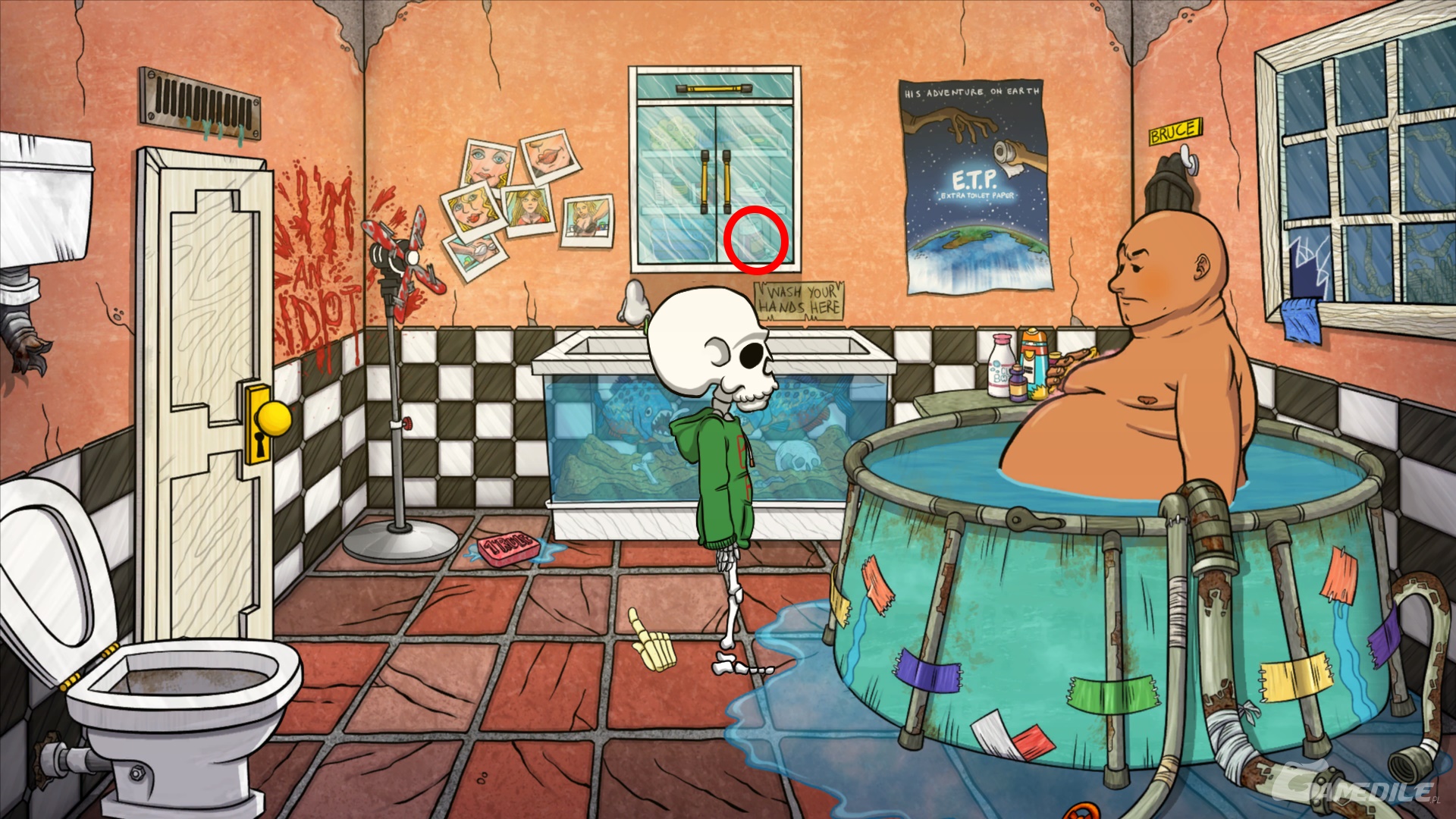 Wracamy na miejsce imprezy, udajemy się na pierwsze piętro i używamy szamponu na drzwiach po prawej stronie. Zostajemy wpuszczeni do łazienki. Otwieramy szafkę i zabieramy płyn do demakijażu (makeup remover). Rozmawiając z kąpiącym się tłuściochem otrzymamy przejściówkę (pass) do muzeum - ta lokacja odblokuje się również na naszej mapie. Właśnie tam się teraz udajemy.