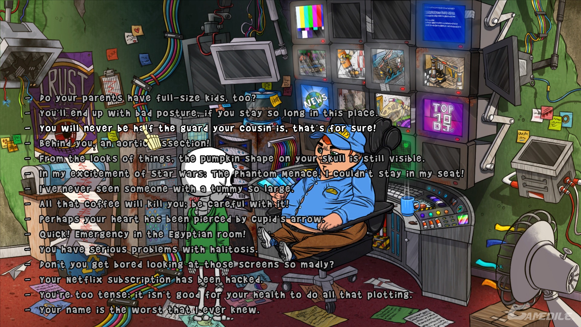 Od razu po przybyciu do muzeum wchodzimy do pomieszczenia monitoringu po prawej stronie. Rozmawiamy z ochroniarzem, aż w końcu przejdzie do bluzgów - musimy go jak najbardziej zdenerwować. Aby osiągnąć to najszybciej, wybieramy następujące dialogi (kolejność nie ma znaczenia):