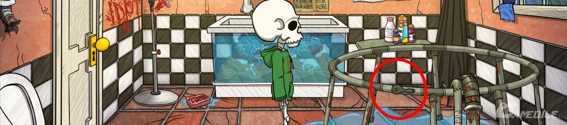 Teraz udajemy się w okolice latarni, by tam wejść do jaskini. Na puszcze z farbą (paint can) używamy papryczki chili - tę łączymy w ekwipunku z probówką. Wracamy na miejsce imprezy i idziemy do łazienki. Powstały koncerntrat kapsaicyny (capsaicin concentrate) dodajemy do soli do kompania (salts) - kąpiący się szybko opuści to miejsce. My wypuszczamy wodę korzystając z kurka, a potem podnosimy plandekę (tarp). Wychodzimy z domu, a przed nim ze skrzynki (mailbox) wyciągamy list miłosny (letter) - używamy na nim płynu do demakijażu. W naszym ekwipunku łączymy też petardy z bombą.