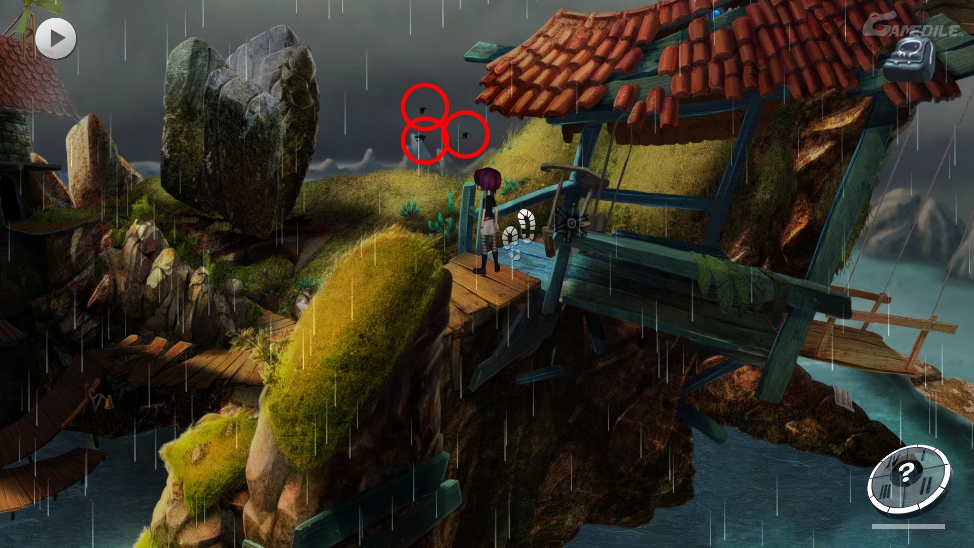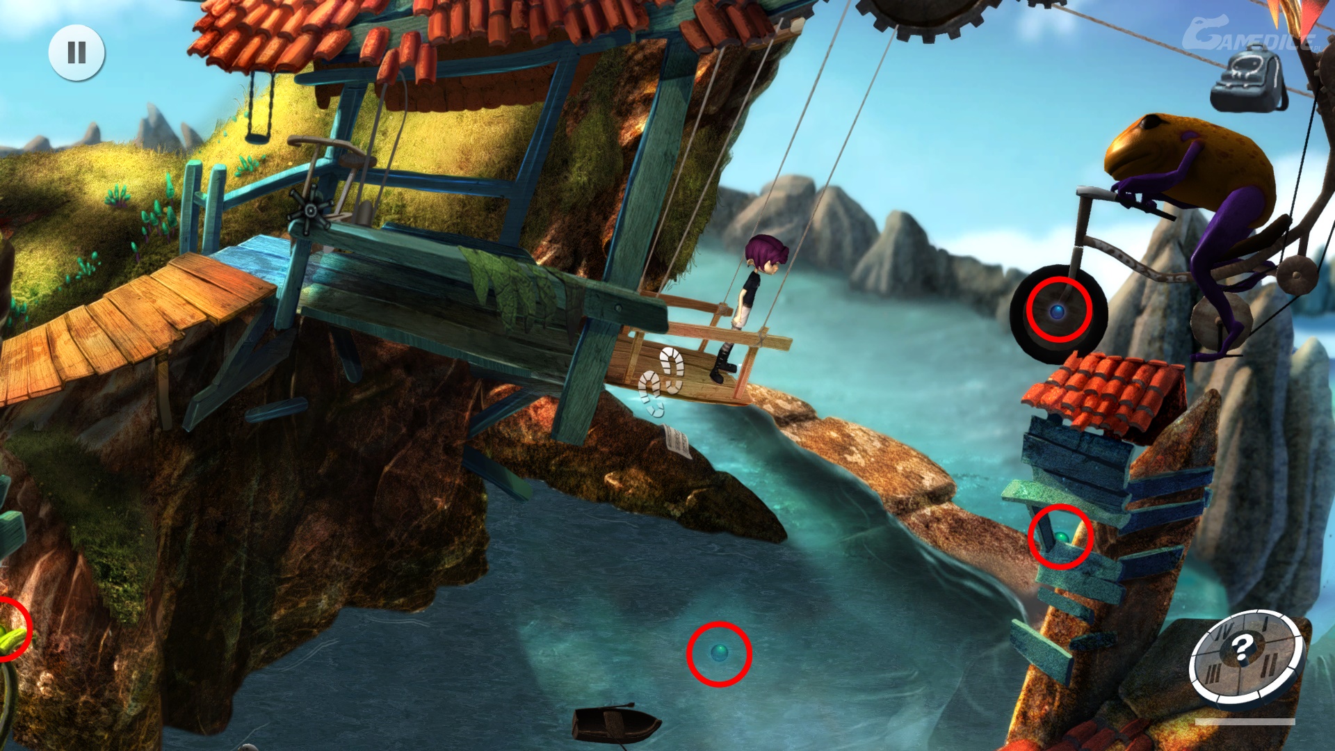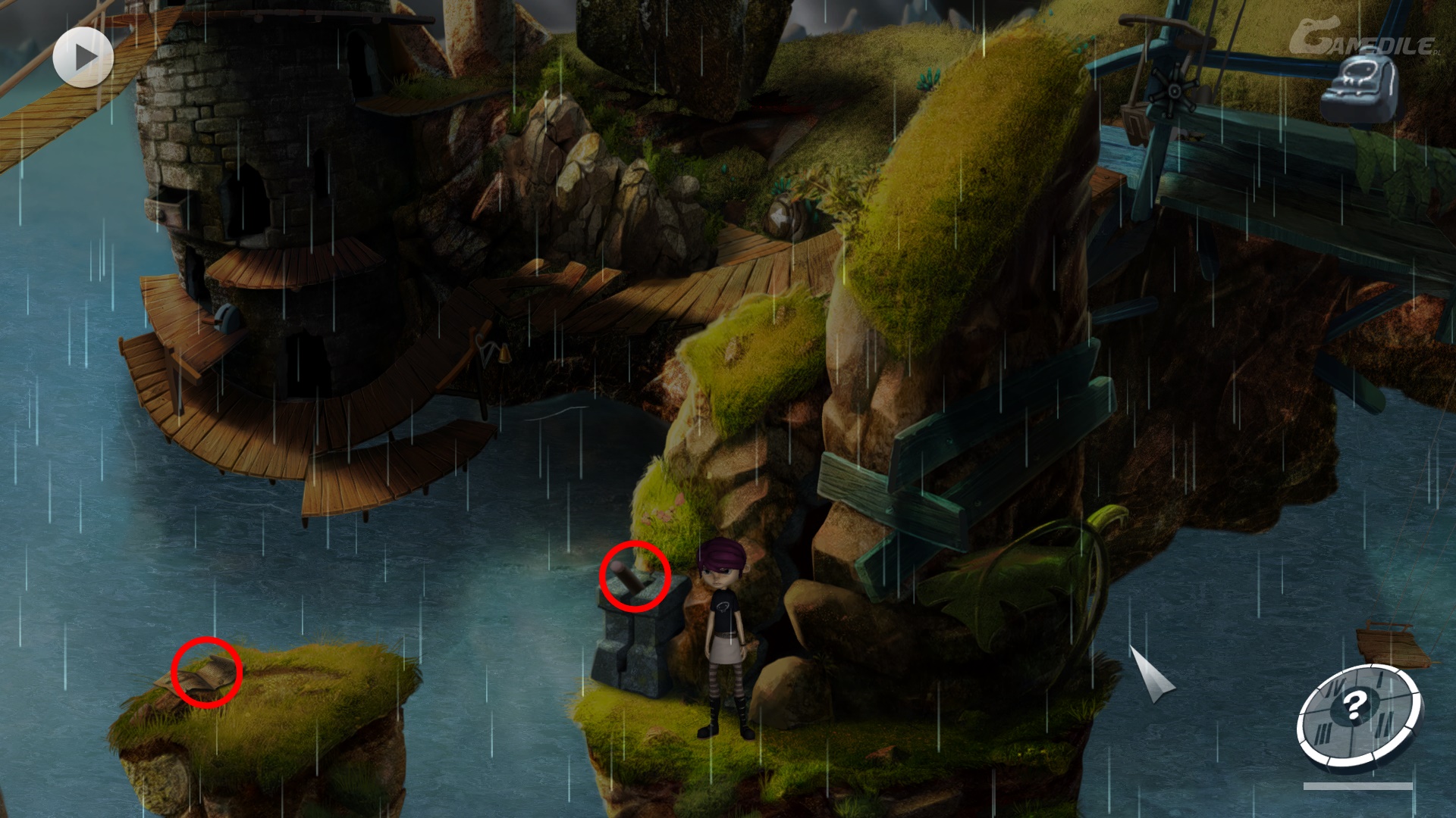 Trafiamy na wyspę. Wchodzimy nieco wyżej po schodkach, a następnie zbieramy dwie kartki - to nuty. Zabieramy kulkę ukrytą za skałą oraz tę na dachu. Przekręcamy korbę, by dostać kolejną. Teraz idziemy maksymalnie w prawo, na drewnianą kładkę.