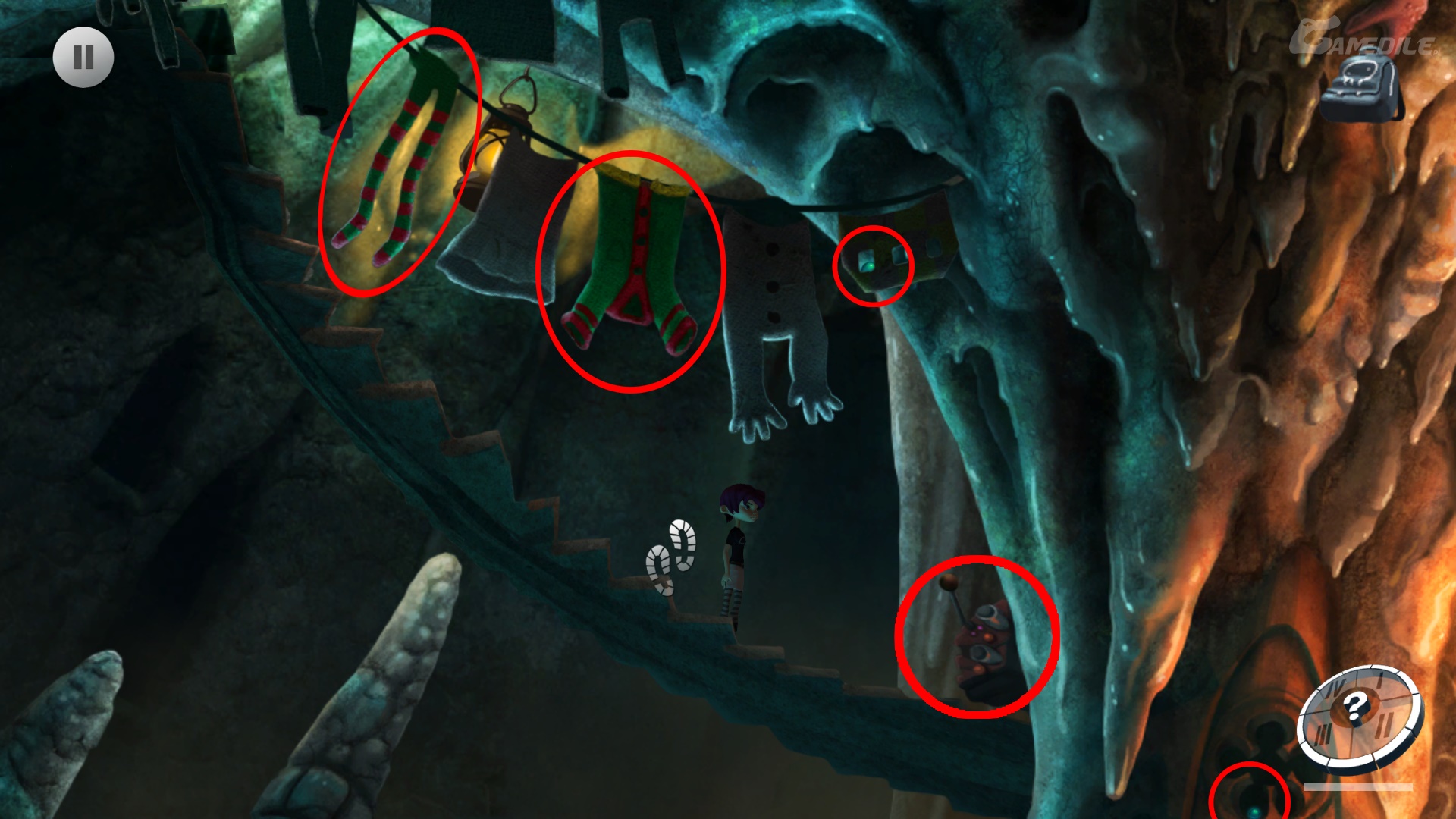 Będąc na miejscu, podnosimy kulki - jedną ukrytą w ubraniu, a drugą widoczną we wnęce na dole. Teraz zbieramy pasiaste przebranie ze sznurka, a na końcu pociągamy za dźwignię na końcu schodów - otwiera to kratę przy wieży na dole. Wracamy do poprzedniej lokacji.