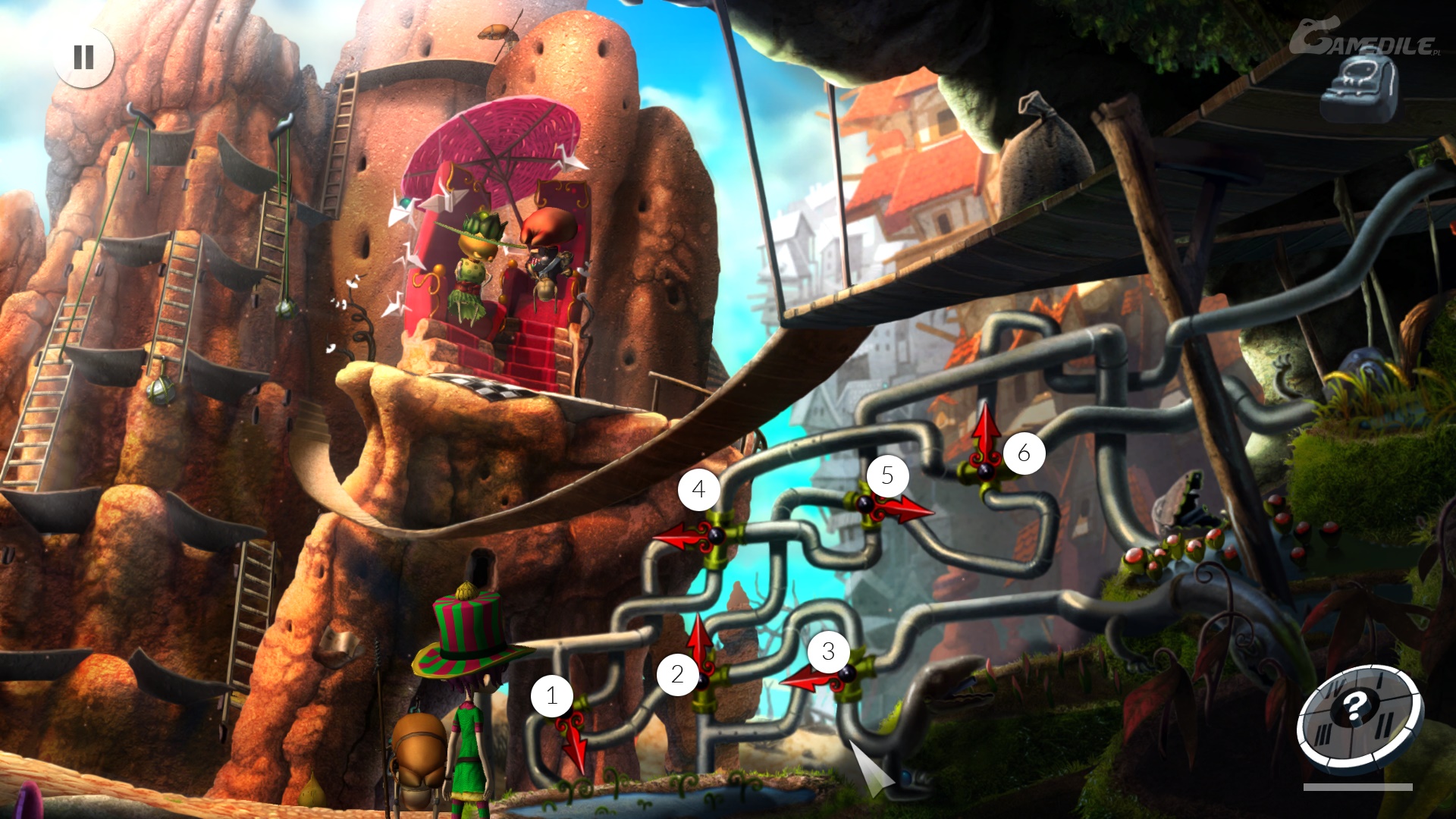 Trafiamy do Kopca. Szukamy kulek - jedną znajdziemy obok tronu, drugą natomiast odsłaniamy po poruszeniu herbu, a trzecią - za skałami na górze. Rozmawiamy ze strażnikiem, od którego dowiadujemy się, że będziemy potrzebowali pozwolenia od pary królewskiej siedzącej nieco wyżej. Obniżamy lewą i prawą drabinę, a następnie wchodzimy po tej drugiej wyżej. Podnosimy ją i znów jej używamy - teraz używamy naszej mocy na obciążniku tuż nad tą drabiną. Drabina wyżej poszybuje w górę. My używamy tej, którą przed chwilą podnosiliśmy - trafi ona jeszcze wyżej. Zabieramy odważnik po lewej stronie - lewa drabina zsunie się na dół, a odważnik trafi do naszej kieszeni. Używamy go na drugiej drabinie od lewej. Wchodzimy na górę i napotykamy na strażnika - powie nam, że musimy odpowiednio wyglądać, by stanąć przed parą królewską. Obecnie mamy jednak tylko kapelusz - schodzimy więc niżej i przechodzimy przez most. Na samym jego końcu przesuwamy worek, by odnaleźć kulkę. Potem przechodzimy w prawo, do kolejnej lokacji.