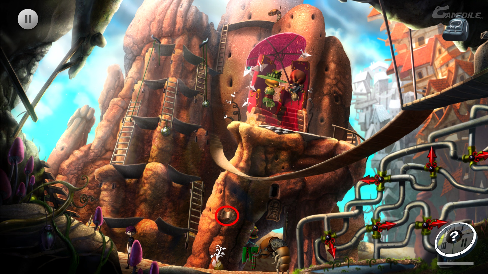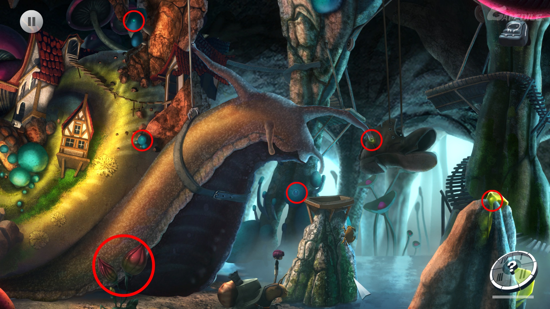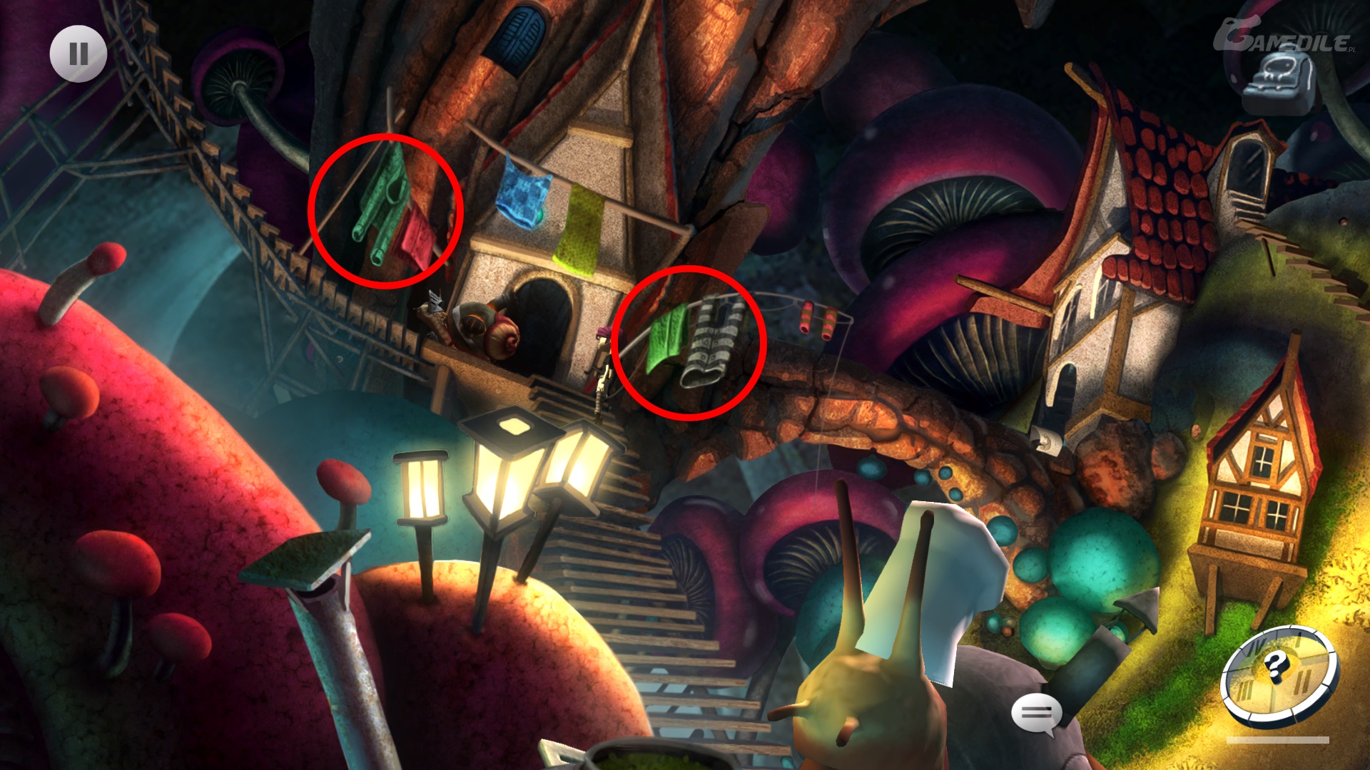 Jeszcze raz zmuszamy ślimaka do połowu - tym razem krab trafi do naszego ekwipunku. Udajemy się zatem w lewo i dajemy gotującemu ślimakowi zarówno kraba, jak i oba rodzaje fasoli. Pojawi się garnek z zupą, który zabieramy. Kierujemy swoje kroki do sznura z bielizną - używamy go, aby ślimak do niego podszedł, a następnie wchodzimy do domku i pędzimy w prawo. Tutaj podnosimy kartkę - przedstawia nam postaci Ślimaków. Idziemy cały czas w prawo, przechodząc przez kolejny budynek i most, aż w końcu dotrzemy do kolejnej lokacji (w międzyczasie możemy znaleźć kulkę na jednym z grzybów oraz kolejną na kryształku znajdującym się na pierwszym planie, gdy mijamy most oraz następną na kwiecie z samej prawej strony).