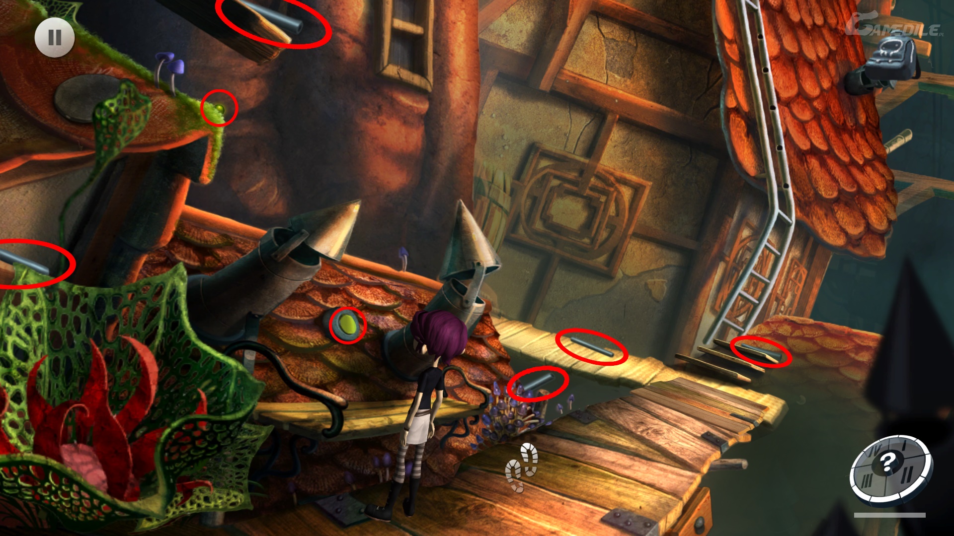 Trafiamy do jaskini z żółwiem. Rozmawiamy z nim - okazuje się, że jest głodny. Dajemy mu więc zupę, a ten odejdzie, odsłaniając nam przycisk. Wciskamy go i zauważamy, że szuflady na górze się podświetliły. Teraz zabieramy kulkę schowaną za pokrytym mchem dachem. Musimy jakoś dostać się na górę, jednak zauważamy, że w drabinie brakuje szczebli. Potrzeba nam pięciu. Jeden znajduje się tuż pod drabiną, drugi - na kładce pod ścianą domku. Trzeci wystaje z dachu tuż obok, a czwarty znajduje się na samej górze po lewej stronie. Ostatni znajduje się niedaleko roślinki znajdującej się po lewej stronie. Gdy już zbierzemy wszystkie elementy, używamy ich na drabince i wchodzimy do góry.
