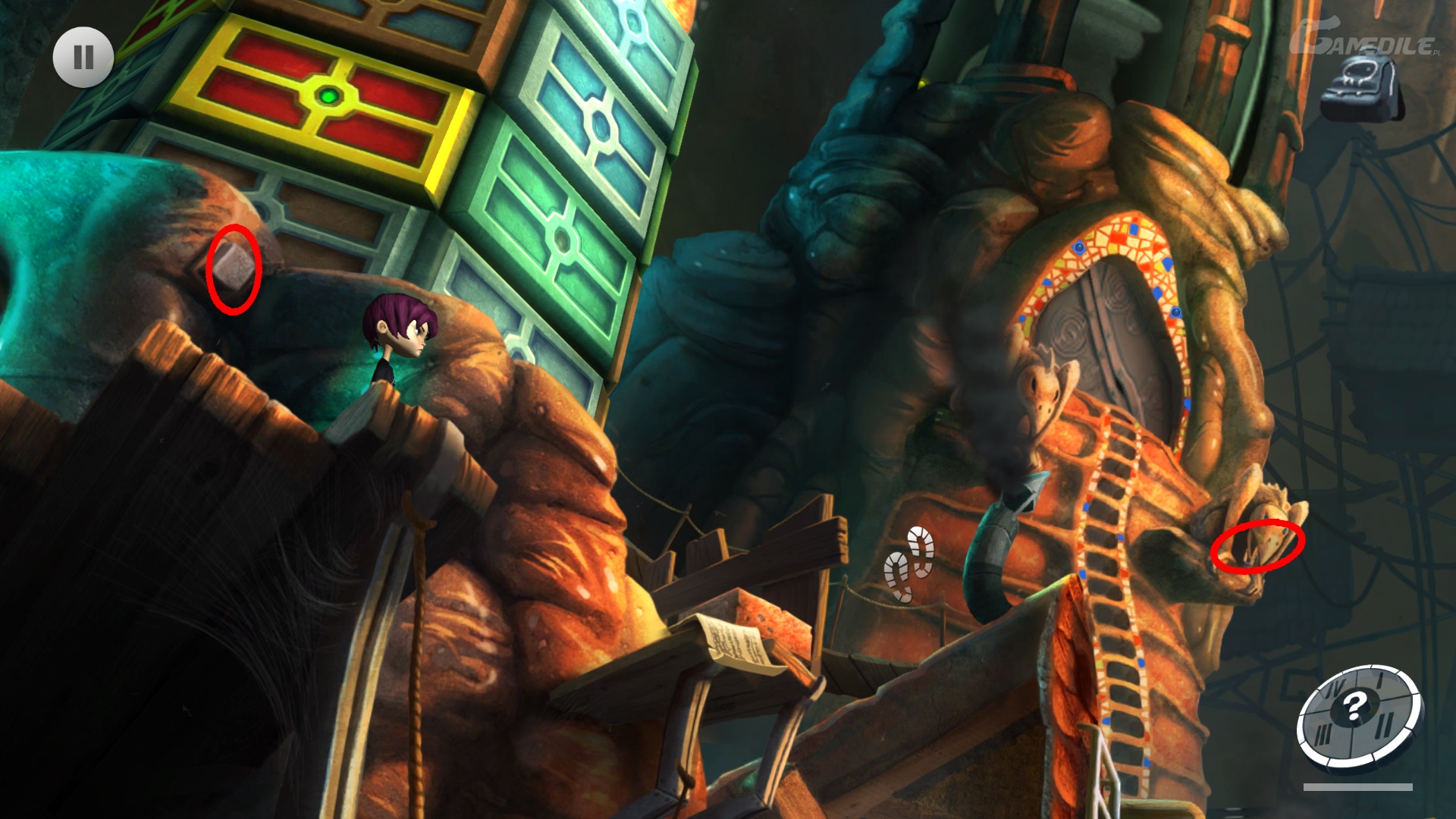 Próbujemy podnieść leżącą po lewej stronie kartkę - choć nie uda nam się to, bohaterka przejdzie w lewo. W głowie posągu po prawej stronie znajdziemy kulkę. Wciskamy kamienny przycisk po lewej stronie, a następnie przybliżamy wieżę złożoną z różnokolorowych szuflad.