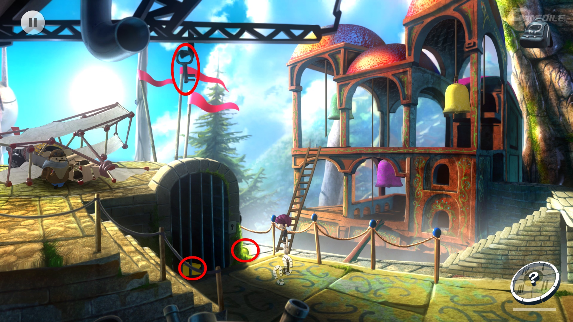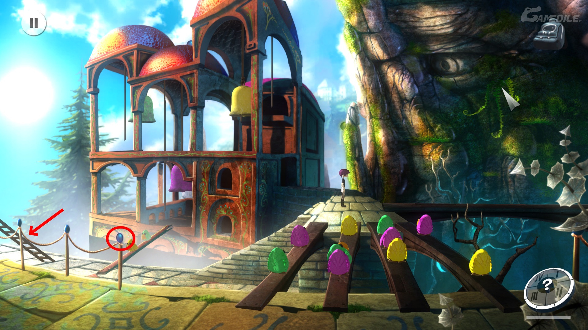 W nowej lokacji, zbieramy kulki. Jedna znajduje się w jednym ze szczebli płotku, jedna schowana jest na dachu, a jedna - za wystającą skałką. Po zebraniu wszystkich kulek, wchodzimy w czarne wejście na górze i uderzamy w żółty dzwon - ptaki powinny zmienić swoją pozycję. Schodzimy niżej i używamy drabiny po lewej stronie - powinna nam dać dostęp do zielonego dzwonu. To właśnie w niego teraz uderzamy - ptaki w tym samym kolorze zmienią swoją pozycję. Teraz uderzamy dwukrotnie w fioletowy dzwon - w ten sposób ptaki tak się przemieszczą, że belka po prawej będzie wolna. Przechodzimy po niej. Tuż obok desek, na niebieskich drzewach znaleźć możemy kolejną kulkę.