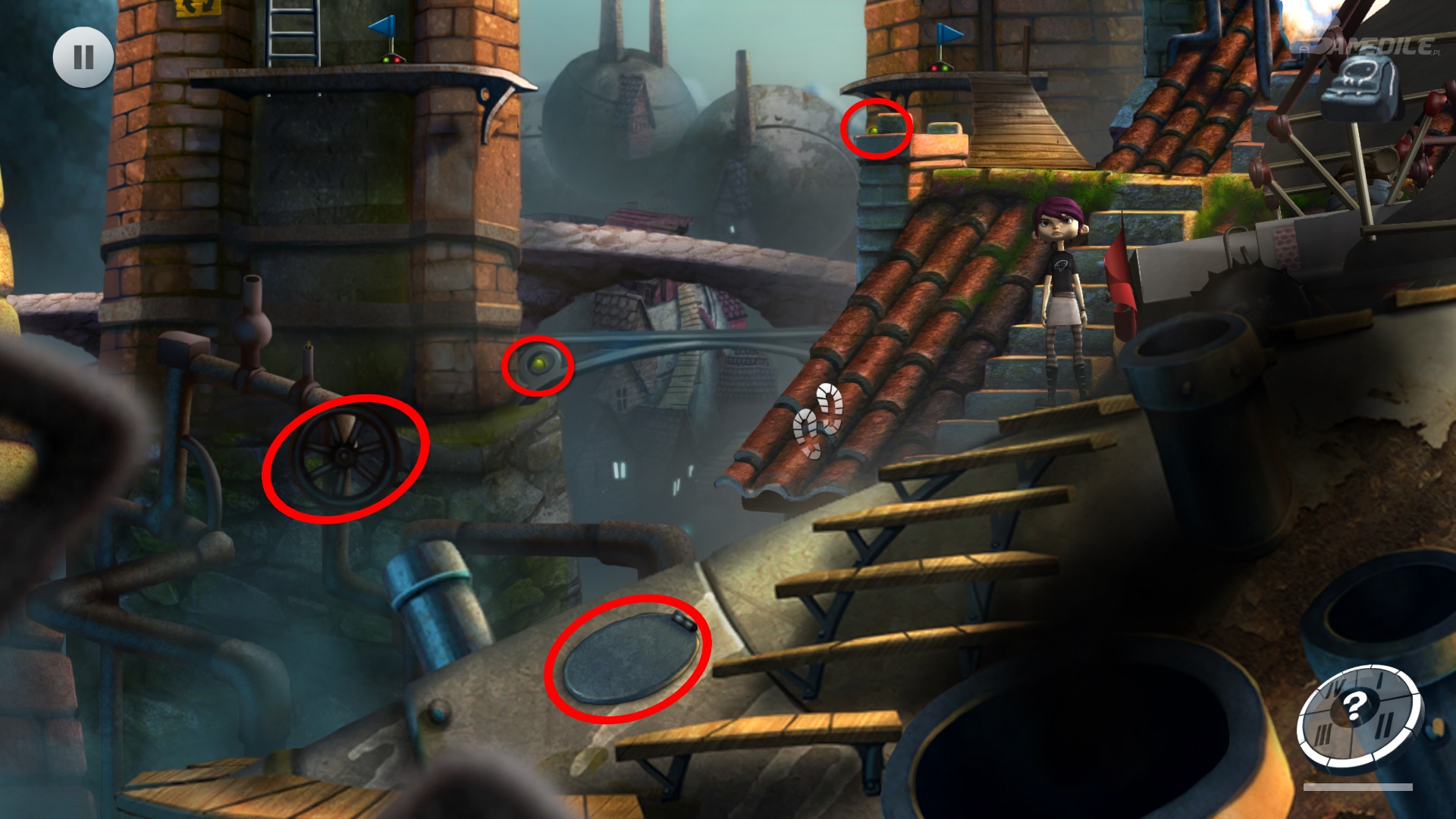 Od razu po przybyciu, zbieramy zielone kulki znajdujące się w oczku mostu oraz na kominie. Podnosimy również właz, gdzie znajdziemy kolejną. Przechodzimy po moście w górę, znajdując się tuż obok flagi. Przekręcamy też kurek, by pozyskać kolejną. Następną znajdziemy w uchwycie drabiny (którą będziemy za moment sunąć).